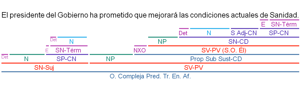 - Localizamos el verbo principal: «ha prometido», y el sujeto «El presidente del gobierno». La estructura es Sujeto + verbo + CD, donde el CD es una proposición sustantiva.