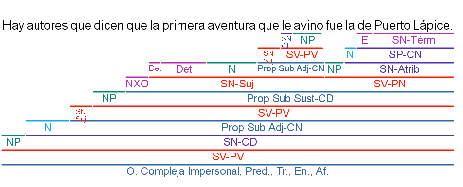- Dentro del CD tenemos una adjetiva que complementa a «autores». En el análisis de la adjetiva tenemos que el «que» es el sujeto -> Los autores dicen. Dicen es transitivo así que volvemos a tener otro CD, esta vez una subordinada sustantiva.