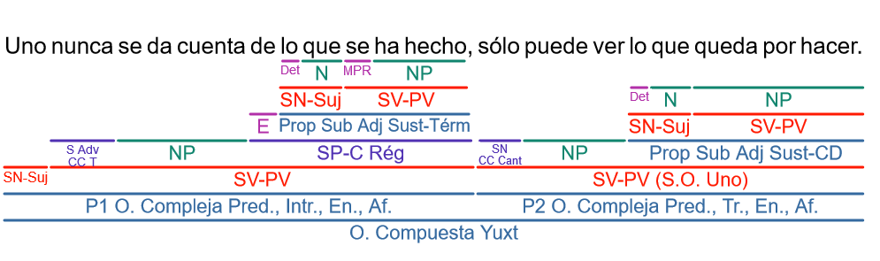 - P2 es una oración compleja, predicativa y transitiva. El verbo principal es «puede ver» y tenemos una subordinada adjetiva sustantivada funcionando de CD. Dentro de ella, el «lo que» es el sujeto -> eso queda por hacer / esas cosas quedan por hacer