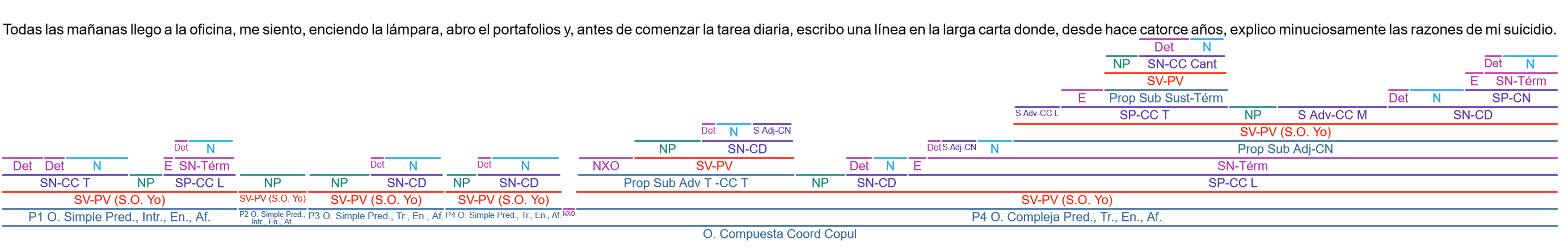 • No os asustéis con la longitud de la oración, que a pesar del tamaño, es muy sencilla de analizar. Se trata de una oración compuesta por coordinación copulativa formada por 5 oraciones.