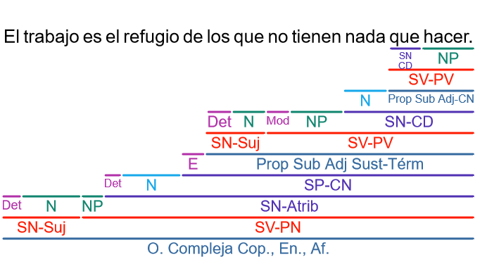 - Dentro del atributo tenemos una subordinada adjetiva sustantivada funcionando como Término dentro de un CN que complementa a «refugio». «Los que» funciona como sujeto dentro de esta ->el que no tiene. En el predicado verbal, en el CD, tenemos una subordinada adjetiva que complementa a «nada», el «que» funciona dentro como CD -> hacer nada
