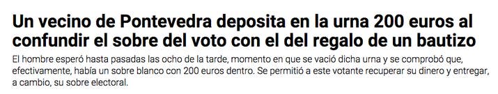13. Un vecino de Pontevedra deposita en la urna 200 euros al confundir el sobre del voto con el del regalo de un bautizo.
